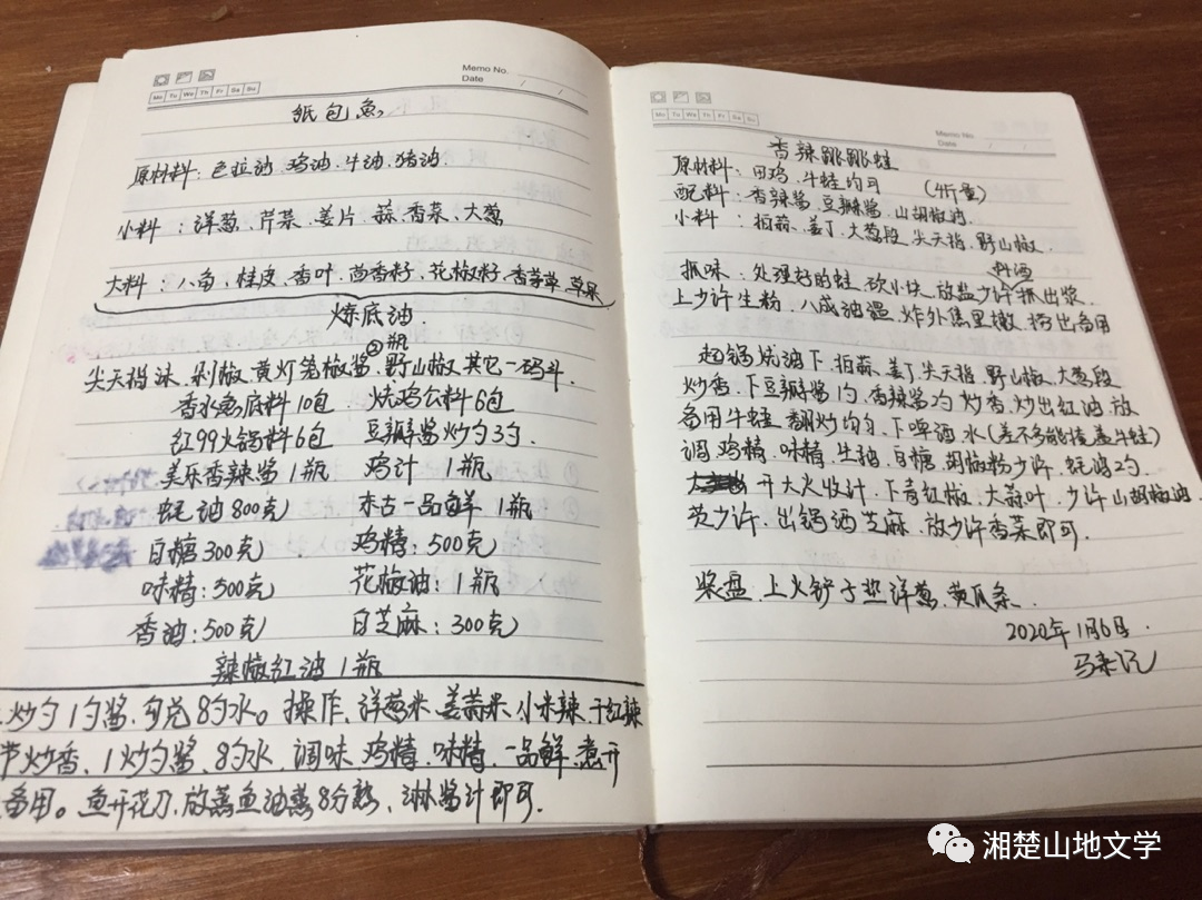 他随身携带了一个笔记本,征得他同意,我翻阅了一下,都是一些美食流程。字符不是特别好看,却很干净工整。我说,能随身携带笔记本,都是好学好样的,没有涂改潦草的字迹,说明他不浮夸,心态平和稳重。他说他在山东一家有名川湘菜馆做主厨,徒弟在碧桂园森林城市一家麻辣香锅主厨遇到了问题,邀请他过来调整菜系招揽生意的,刚刚有了起色,疫情来了,他也被困住了。瞧,他今天指导群主程先生做家常回锅肉,铁板鱼,还能和被邀请共进午餐的美国人,来几句英语,一个十五岁就出来闯世界的小伙子,到底藏着多少才艺?