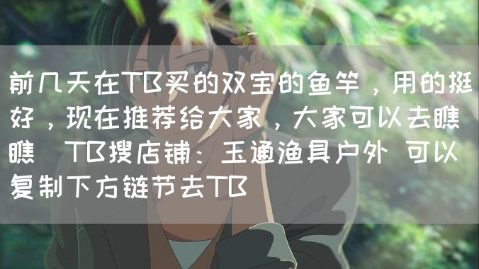 前几天在TB买的双宝的鱼竿,用的挺好,现在推荐给大家,大家可以去瞧瞧 TB搜店铺:玉通渔具户外 可以复制下方链节去TB