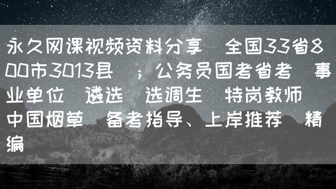 永久网课视频资料分享(全国33省800市3013县);公务员国考省考|事业单位|遴选|选调生|特岗教师|中国烟草(备考指导、上岸推荐)精编。。人生自是有情痴,此恨不关风与月。百岁落半途,前期浩漫漫。到家应是,童稚牵衣,笑我华颠。