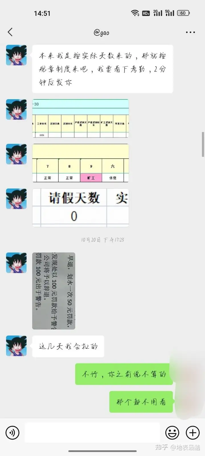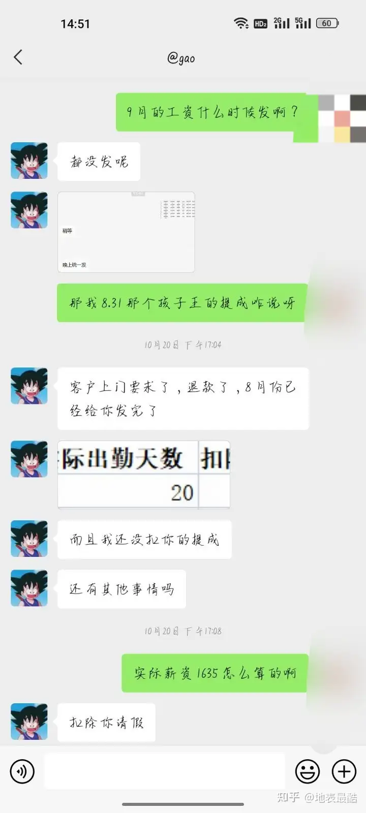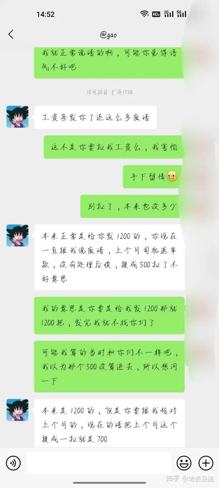 我刚离职觉得他不是这个公司的老板,他只是老板的走狗,工资应该也不归他管,也不是他发,我抱着这个心态把他删了。结果到了到手的的工资不对,我就去找老板质问了,然后又是让我去找高走狗,两个人就互相踢皮球!后来发9月份的工资的时候,都快五点了我还没收到钱,我以为不发了,就去问了老板,老板让我去找高走狗,无奈之下我又把高走狗加了回来,然后他发了工资条给我,我就质问他为什么扣我工资,然后他说发完了无可奉告,一副狗仗人势的样子。我想着先不和他纠结扣工资的事了,先把工资拿到手再说,毕竟他们一群人不是啥好人,然后我就问高走狗什么时候发工资,他就在那给我瞎扯,我本来想着你告诉我什么时候发我就不烦你了,他一直不说,扯东扯西,后来觉得我态度不好就开始乱扣工资了,总共扣了850!