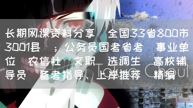 长期网课资料分享(全国33省800市3001县);公务员国考省考|事业单位|农信社|文职|选调生|高校辅导员(备考指导、上岸推荐)精编。。半亩方塘一鉴开,天光云影共徘徊。读书破万卷,下笔如有神。传闻一战百神愁,两岸强兵过未休。